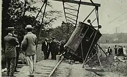 The car toppled over on its maiden voyage while rounding a curve with 100 passengers aboard, more than twice the normal capacity of 40 people.[4][21] A number of passengers were injured, one seriously. Howard Tunis, who was operating the vehicle, received a broken rib, and his 6 year old daughter Eugenia suffered bruises.[21][30]