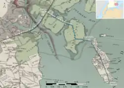 Detail of the route of Pelham Park Railroad on a modern map. Shoreline and road locations are significantly different from what they were at the time the railroad was built.