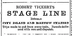 Prior to the building of Bartow Station, a stagecoach service operated by Robert Vickery ran between Mount Vernon and City Island. This ran until 1887. Another stagecoach service was operated by two brothers who ran a grocery store on the island; the stagecoach was used to make deliveries to local residents.[1]