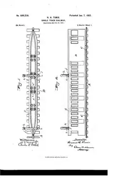 An experimental operation of a monorail by Howard Hansel Tunis at Virginia's Jamestown Exposition of 1907 impressed the management of the Pelham Park Railroad, which sought permission for its own construction with support from his Monoroad Construction Company.[18][19] The proposed cars were 50 feet (15 m) long by 6.5 feet (2.0 m) wide, with pointed ends. The plans called for a car which was supported by 4 double-flanged wheels riding on a single rail, with two 4-wheeled trucks on top of the car engaging with an overhead guide rail. John H. Starin predicted that the cars would be capable of 80–100 miles per hour (130–160 km/h).[20] The trip from Bartow Station to City Island would take 3 to 5 minutes, compared to the 40 minute trip by the horse-drawn car.[21]