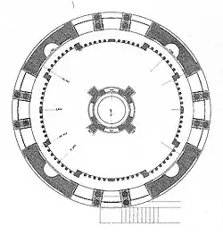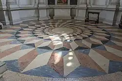 The chapel is accessible exclusively from the church hall through a monumental entrance portal, from which one is first ushered into a square vestibule, covered by a coffered barrel vault, and then into the building proper, through a second portal.[18] The monumental vestibule is a rather original solution and a result of the need to prevent the structure from interfering with the Avanzi and Medici chapels already present in San Bernardino.[11] The building has a circular plan with a diameter of 12 meters and a height of 20.5 meters, divided into two orders by a balcony with parapet and covered by a coffered dome crowned by a lantern;[18] the diameter of the first order is smaller than that of the upper one, a feature that distinguishes this chapel from others, where, moreover, the dome often stands directly on the first order.[19][20]