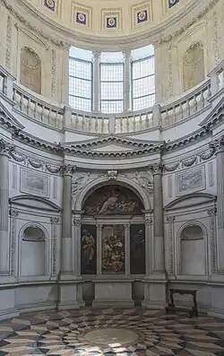 On the chapel's high altar, in front of the entrance, there is a painting by Bernardino India from 1579 depicting the Madonna and Child with St. Anne;[9] in the crescent a painting by Pasquale Ottini depicts the Eternal Father, while on either side of India's altarpiece there are two other paintings by Ottini depicting St. Joseph and St. Joachim.[24] Ottini's paintings were probably made between 1619 and 1623.[25] The building was intended to house other paintings, as evidenced by blank panels in the walls, which, however, were never made.[21]
