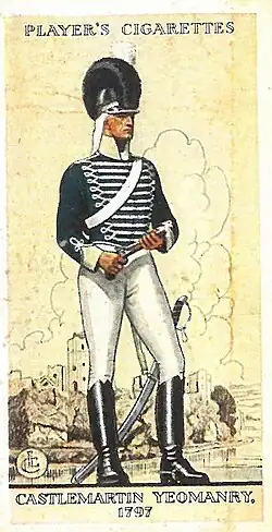 After Britain was drawn into the French Revolutionary Wars, Prime Minister William Pitt the Younger proposed on 14 March 1794 that the counties should form a force of Volunteer Yeoman Cavalry (Yeomanry) that could be called on by the King to defend the nation against invasion or by the Lord Lieutenant to subdue any civil disorder within the county. By the end of the year 27 counties had raised Yeomanry.[1][2] Lord Milford, Lord Lieutenant of Haverfordwest and Pembrokeshire, was one of the first to act and the Castlemartin Troop was raised at Castlemartin, Pembrokeshire, on 22 April 1794 by John Campbell (later Lord Cawdor). Except in the case of actual invasion it was only to operate within Pembrokeshire and the neighbouring counties of Carmarthenshire and Cardiganshire. The Pembroke Yeoman Cavalry[a] of four troops followed on 17 July under the personal command of Lord Milford.[4][5][6][7]
