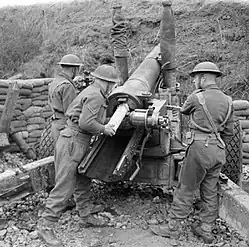 The regiment remained in North Africa and on 18 September 1943 was converted into 102nd (Pembroke Yeomanry) Medium Regiment (its title finally reflecting the departure of the Cardigan batteries).[7][5][6][77][75][90] It landed in Italy to join Eighth Army in December 1943 and fought in the Italian Campaign, including the battles round Monte Cassino and the breaching of the Gothic Line (Operation Olive). By the end of the war the regiment was on the banks of the River Po.[7] 102nd (Pembroke Yeomanry) Medium Regiment and its batteries passed into suspended animation on 15 January 1946.[77][90][91]