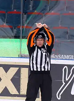 A referee giving the signal for a penalty shot.