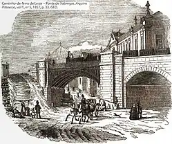 In 1854, the Viaduto de Xabregas, serving Linha do Norte—the most important railway line in Portugal—was built. The structure consists of two sections - one with stone arches and the other with metal beams. The metal section, built in 1854 and designed by John Sutherland and Valentine C. L., had a span of 15.60 meters, while the stone arch section is about 36 meters long. The metal beams were replaced in 1954.[7]