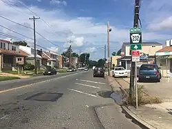 After passing the naval facility, Oxford Avenue continues northeast at the intersection with Robbins Street/Martins Mill Road and crosses Levick Street.[5] PA 232 runs north through the residential Lawncrest neighborhood and reaches the Five Points intersection with PA 73 (Cottman Avenue) and Rising Sun Avenue in the Burholme neighborhood. From this junction, the route passes a mix of urban residential and commercial establishments as it comes to a bridge over CSX's Trenton Subdivision railroad line at the Bleigh Avenue intersection and reaches a junction with Verree Road. PA 232 continues into the Fox Chase neighborhood, crossing SEPTA's Fox Chase Line at-grade south of its terminus at the Fox Chase station.[4][5] The route heads into the downtown area of Fox Chase and passes east of SEPTA's Fox Chase Bus Loop before coming to the Rhawn Street intersection, where the road makes a turn to the northwest.[4][5]