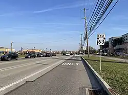 PA 63 turns into a four-lane divided highway that soon becomes undivided as it crosses over the Pennsylvania Turnpike (I-276) and Norfolk Southern's Morrisville Line before heading into a mix of residential and commercial areas as a five-lane road again. Upon forming the border between Upper Moreland Township and Abington Township, the road name changes to Moreland Road and it briefly turns into a divided highway at the Fitzwatertown Road intersection. The route heads into the community of Willow Grove as a five-lane road. The road enters business areas, becoming a divided highway again as it passes to the northeast of the Willow Grove Park Mall. PA 63 intersects Easton Road and loses the median at the Davisville Road junction before crossing SEPTA's Warminster Line at-grade. The route passes a mix of homes and businesses as it comes to an intersection with PA 611 (Old York Road).[3][4]