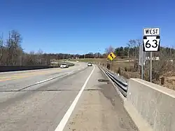In the area of this intersection, PA 63 is briefly a divided highway. After PA 113, the road passes through the center of Harleysville. The road turns south, becoming a three-lane road with a center left-turn lane before it heads to the southeast again as a two-lane road, continuing past a mix of farm fields and residential and commercial development.[3] PA 63 bypasses the community of Mainland to the northeast with two westbound lanes and one eastbound lane. After crossing Skippack Creek, the road enters Towamencin Township at the Wambold Road intersection, at which point it heads into the North Penn Valley region.[4]