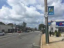 At the Laurel Avenue intersection, PA 73 becomes Cottman Avenue and turns into a three-lane road with one eastbound lane and two westbound lane that forms the border between the city of Philadelphia in Philadelphia County to the northeast and Cheltenham Township in Montgomery County to the southwest, coming to the entrance to the Fox Chase Cancer Center and Temple University Hospital – Jeanes Campus to the northeast of the road. The route passes between Burholme Park in Philadelphia and homes in Cheltenham Township. The road passes more homes and fully enters Philadelphia upon passing under SEPTA's Fox Chase Line south of the Ryers station in the Ryers neighborhood. PA 73 heads into Northeast Philadelphia and becomes a four-lane road as it runs through commercial areas, reaching a bridge over CSX's Trenton Subdivision railroad line.[4][7] The route intersects Rising Sun Avenue and PA 232 (Oxford Avenue) at a junction locally known as Five Points.[4][7][8] The road heads past a mix of homes and businesses, running between the Burholme neighborhood to the northeast and the Lawncrest neighborhood to the southwest. After crossing Algon Avenue, the route passes to the southwest of Northeast High School. PA 73 gains a center left-turn lane and crosses Castor Avenue near the Rhawnhurst neighborhood. The route continues past several shopping centers and intersects Bustleton Avenue, at which point it passes southwest of Roosevelt Mall. PA 73 comes to an interchange with US 1 (Roosevelt Boulevard), intersecting the local lanes at-grade and passing over the express lanes.[4][7]