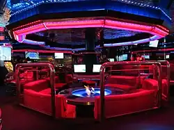 The Peppermill is noted for its retro 1970s appearance.[22][23][24] The interior features a blue and purple color scheme,[25][26][27] as well as neon lights, fake vegetation, and mirrored ceilings.[8][28] Tiffany lamps are hung above the tables and feature a flamingo design.[6][29]