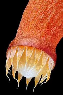 The basidiocarps of some gasteroid fungi – such as puffballs and earthstars – release spores through an apical opening that is termed a peristome and is variously delimited, its features often being diagnostic when distinguishing closely related species.[2]