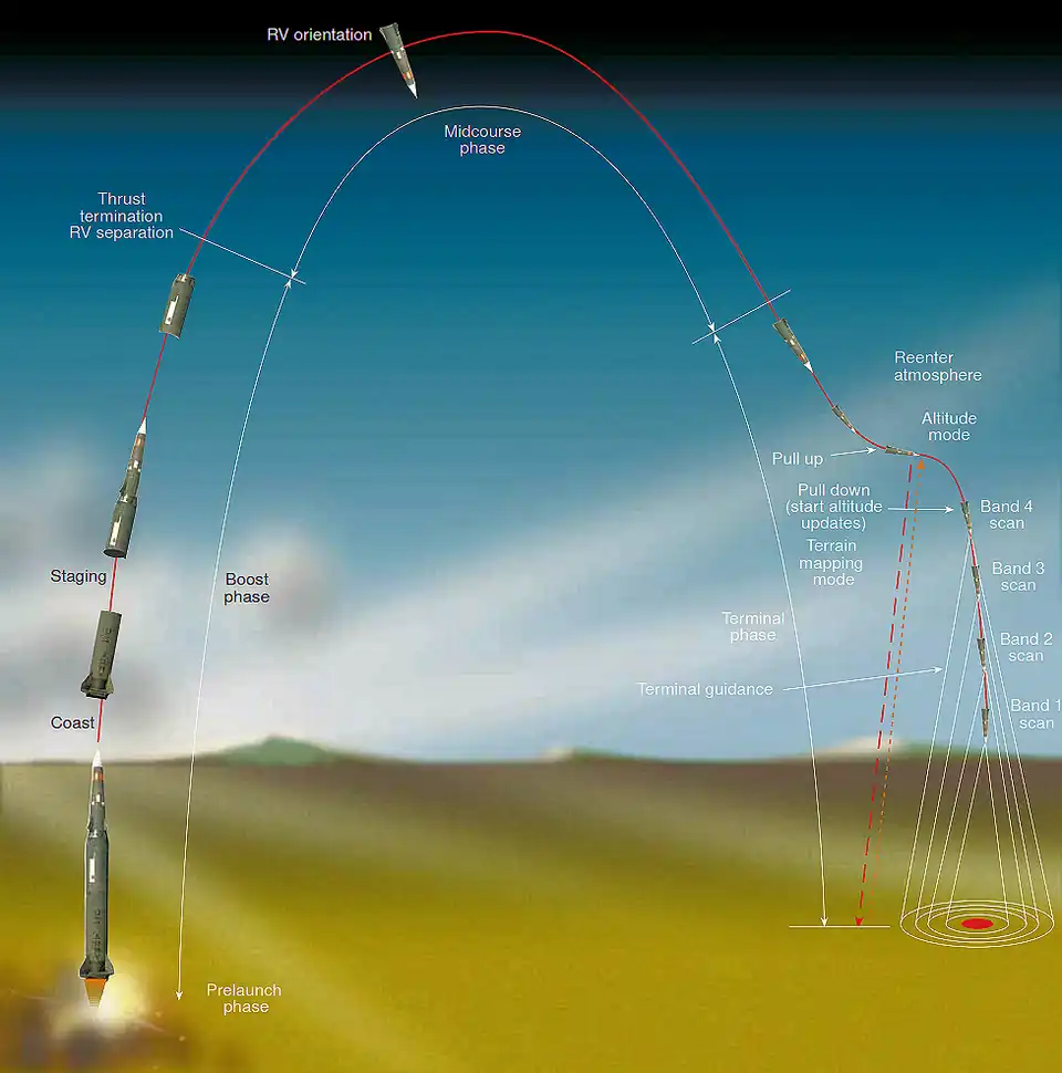 The midcourse phase of the trajectory was initiated at RV separation and continued until the terminal phase began. At the beginning of the midcourse phase, the RV was pitched down to orient it for reentry and to reduce its radar cross-section. The midcourse attitude was then controlled by the RV vane control system during atmospheric exit and reentry, and by a reaction control system during exoatmospheric flight.
