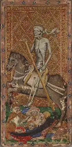 In Western Europe, Death has commonly been personified as an animated skeleton since the Middle Ages.[18] This character, which is often depicted wielding a scythe, is said to collect the souls of the dying or recently dead. In English and German culture, Death is typically portrayed as male, but in French, Spanish, and Italian culture, it is not uncommon for Death to be female.[19]