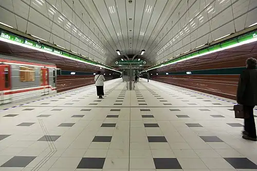 The tunnel of the station is the largest underground structure in the Prague Metro system,[2] at 217m long, 16m high and 22m wide, located 40m below the surface.[3] The station was designed by architect Jiří Pešata.[4]