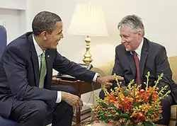 On 4 March 2008, Ian Paisley announced that he would step down as Leader of the DUP and First Minister that May.[24] On 14 April 2008, Robinson was nominated unanimously by the DUP MLAs as leader-designate with Nigel Dodds as deputy leader-designate and on 17 April 2008 they were both ratified by the DUP's 120-member executive committee.[25][26] He formally became leader on 31 May 2008.