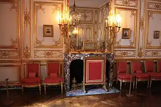 The cabinet intérieur (1740 plan #4) served a number of purposes: it housed part of Louis XV's numismatic collection and collection of miniature paintings; it served as a dining room; and, it served as a workroom. Of all the rooms of the petit appartement du roi during the reign of Louis XV, this was perhaps one of the most richly decorated and opulently appointed (Verlet 1985, p. 452).[3]