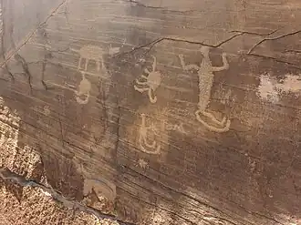 A portion of the canyon measuring approximately 800 feet (240 m) long features numerous prehistoric petroglyphs, both on the canyon walls and on boulders. At least eighteen different groups of carvings are known, in addition to features such as hearths and small pieces of stone resulting from the manufacturing process for stone tools. Most of the petroglyphs were created by "pecking" tiny holes, although one group is formed of lines that were clearly engraved into the rock.[2]: 2  The majority of designs at Petroglyph Canyon feature humans or large game animals such as bison and bighorn sheep. Some carvings clearly feature men or women, many of which appear with sexual imagery such as phallic symbols or external female genitalia respectively.[2]: 3  Some of the carvings are old enough that they have begun to weather to the dark color of the surrounding stone, but most show little sign of erosion. A few designs at the site, such as personal names, have obviously been added much more recently by vandals, but such carvings are rare and were typically placed near older designs instead of on top of them.[2]: 2