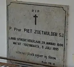 Petrus Josephus Zoetmulder S.J. (January 29, 1906 – July 8, 1995) was an Indonesian expert in the Old Javanese language. He came from Utrecht and was associated with the Society of Jesus by 1925. He worked at Leiden University in the 1930s. His first work appeared in 1930 and he continued to write into the 1990s. He lived in Yogyakarta and was interred in the Jesuit necropolis at Muntilan, Java.