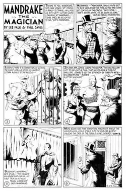 In 1933, Davis met St. Louis advertising agency executive Lee Falk, and the two began their collaboration on Mandrake the Magician. Falk asked Davis to do a dozen panels on spec. Davis did so, and in 1934 Falk went to New York and pitched the concept to King Features Syndicate. The strip was launched June 11, 1934 with Davis illustrating and Falk scripting.[3] One of Davis' assistants was Ray Moore, who later became the first artist on Falk's other comic strip, The Phantom, also distributed by King Features.