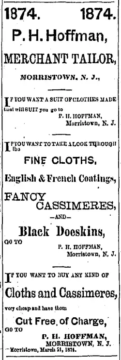 Circa 1864, under Cross & Hoffman,[8] the two ran a clothing and dry-goods business in Morristown.[15] Some time after 1866, Cross sold his interest and moved elsewhere.[8] After Cross's departure, Hoffman continued to manage the store alone. An 1874 advertisement refers to the store as P. H. Hoffman, Merchant Tailor.[8]