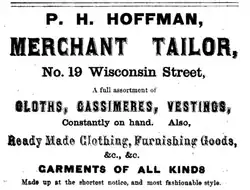 They moved in March 1856 to Milwaukee, Wisconsin, where Hoffman engaged in business under P. H. Hoffman, Merchant Tailor at No. 19, Wisconsin Street. However, he suffered from ill health "occasioned by the change in climate." The family returned to Morristown in the fall of 1857.[8]