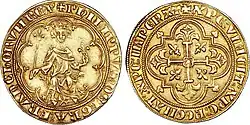 The defeat at the battle of Golden Spurs in 1302 was a crushing blow to French finance: the 15 months which followed this battle saw a depreciation of the currency by 37%, and new decrees were issued forbidding the export of gold and silver abroad.[34] The royal government had to order officials and subjects to provide all or half, respectively, of their silver vessels for minting into coins.[34] New taxes were levied to pay for the deficit.[34][35] As people attempted to move their wealth out of the country in non-monetary form, Philip banned merchandise exports without royal approval.[34] The king obtained another crusade tithe from the pope and returned the royal treasure to the Temple to gain the Templars as his creditors again.[34]