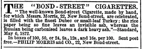 An 1872 advert in The Morning Post for Morris's cigarettes
