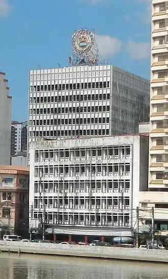 The PNB Building was constructed from 1962 to 1965[1] and was inaugurated in 1966[2] by its namesake and tenant, the then-state owned Philippine National Bank (PNB). PNB occupied the building until 1996 when the banking firm was privatized.[1] It then moved its headquarters to Pasay sharing a lot in the Financial Center estate with Philippine Airlines. The PNB was the main government finance body prior to the establishment of the Bangko Sentral ng Pilipinas, the Philippines' central bank.[3] The building housed the City College of Manila before it was abandoned.[1]