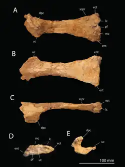 The last vertebra is the C9 according to Pereda-Suberbiola and colleagues (Kellner's C8,[11]) which is visible in hind view, and its preserved part is 75 mm (3.0 in) high. Its neural arch has a large neural spine and well-developed transverse processes (which projected from the sides of the centrum and acted as attachment points for muscles and ligaments). The neural spine terminates in a blunt process above, and the hind side of the neural spine has an oval depression, which has thick vertical edges at its sides. The transverse processes are long and slender, and project to the sides and slightly downwards. The neural canal is small and nearly circular, is about 22 mm (0.87 in) in diameter, and there are no pneumatic foramina near it. Its condyle is broad, around five times wider than high, and is crescent-shaped in cross-section. The left postexapophysis is placed at the side of the condyle and almost vertical. Though none of the vertebrae preserve cervical ribs, the development of the transverse processes of the last vertebra indicates that it probably had ribs.[1] The indeterminate bone fragment associated with the two last vertebrae has a similar texture to them, is flat and crescent-shaped, and is about 9 mm (0.35 in) wide and 44 mm (1.7 in) long.[1]