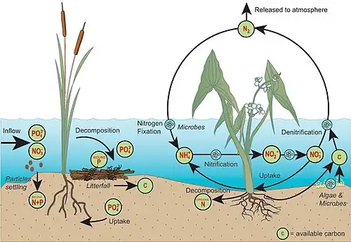 Wetlands are frequently applied to solve the issue of eutrophication. Nitrate is transformed in wetlands to free nitrogen and discharged to the air. Phosphorus is adsorbed by wetland soils which are taken up by the plants. Therefore, wetlands could help to reduce the concentration of nitrogen and phosphorus to remit eutrophication. However, wetland soils can only hold a limited amount of phosphorus. To remove phosphorus continually, it is necessary to add more new soils within the wetland from remnant plant stems, leaves, root debris, and undecomposable parts of dead algae, bacteria, fungi, and invertebrates.[44]