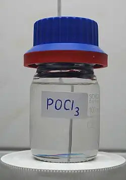 Phosphoryl chloride (commonly called phosphorus oxychloride) is a colourless liquid with the formula POCl3. It hydrolyses in moist air releasing phosphoric acid and fumes of hydrogen chloride. It is manufactured industrially on a large scale from phosphorus trichloride and oxygen or phosphorus pentoxide.[4] It is mainly used to make phosphate esters.