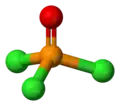 Like phosphate, POCl3 is tetrahedral in shape.[6] It features three P−Cl bonds and one strong P–O bond, with an estimated bond dissociation energy of 533.5 kJ/mol. Unlike in the case of POF3, the Schomaker-Stevenson rule predicts appropriate bond length for the P–O bond only if the P–O bond is treated as a double bond, P=O. More modern treatments explain the tight P–O bond as a combination of lone pair transfer from the phosphorus to the oxygen atom and a dative π back-bond that produces an effective [P+]-[O−] configuration.[7]