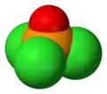 Phosphoryl chloride exists as neutral POCl3 molecules in the solid, liquid and gas states. This is unlike phosphorus pentachloride which exists as neutral PCl5 molecules in the gas and liquid states but adopts the ionic form [PCl4]+[PCl6]− (tetrachlorophosphonium hexachlorophosphate(V)) in the solid state. The average bond lengths in the crystal structure of POCl3 are 1.98 Å for P–Cl and 1.46 Å for P=O.[5]
