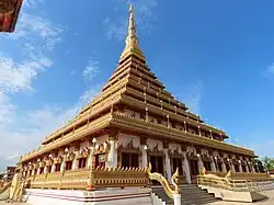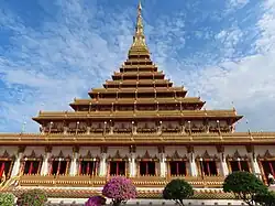 Phra Mahathat Kaen Nakhon,(Thai: พระมหาธาตุแก่นนคร) Kaen Nakhon, 'The Great Buddha's Relics' or 'The Nine Story Stupa Located in Wat Nong Waeng,' is a Thai royal temple of the old town. Wat Nong Waeng is located close to Kaen Nakhon marsh on Klangmuang Road, Muang District. Phra Mahathat Kaen Nakhon was established to celebrate the Golden Jubilee Celebrations of His Majesty Bhumibol Adulyadej's accession to the throne and to celebrate the 200th anniversary of Khon Kaen province's establishment. Its thorough spire, Isaan fishnet shape, Indochina-Dvaravati Era Style, imitated Phra That Kham Kaen. Its base is a square shape of 50 meters on each side and 80 meters in height, where are situated the four-mini-Buddha's relics in each corner sheltered by a seven-head-nāga crystal wall.[1][2]