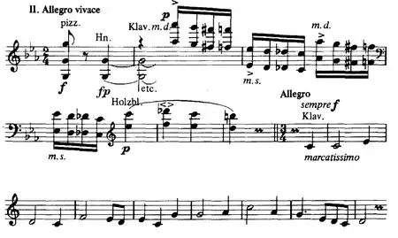 The Allegro vivace begins as a playful and cunning scherzo (although still in C minor), deriving its main theme from the original chromatic subject in the beginning of the first movement. There is a bold switch to 6/8 time, and the piano leads the orchestra into a new brief but energetic theme. Eventually the orchestra moves into a lush Andante, recapitulating the chorale-style melody. Rather suddenly, the piano climbs up to a flurry of double octave trills and a climactic trumpet fanfare, leading to the jubilant finale based once more on the hymn theme played at triple time. The concerto concludes with the piano, in cadenza-like cascades, guiding the orchestra to a fortissimo close.