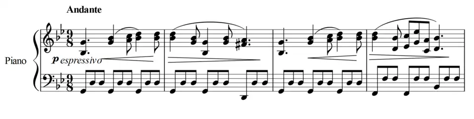 The andante movement, in G minor, uses a tranquil theme in 9
