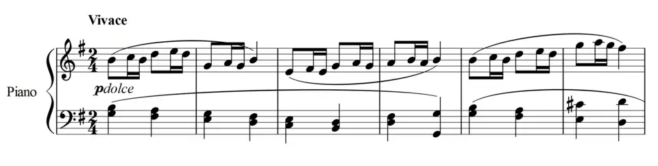 The Piano Sonata No. 25 in G major, Op. 79, was composed by Ludwig van Beethoven in 1809. It is alternatively titled "Cuckoo" or "Sonatina," and it is notable for its shortness.[1] A typical performance lasts only about nine minutes.[2] The work is in three movements: a fast-paced Presto alla tedesca, a slower Andante, and a lively Vivace.