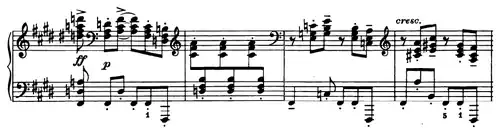The work features one of the strange occurrences of the complete mystic chord spelled in fourths (mm. 264 and 268). Jim Samson[9] points out that it fits in well with Scriabin's predominantly dominant quality sonorities and harmony as it may take on a dominant quality on C or F♯. This tritone relationship between possible resolutions is important to Scriabin's harmonic language, and it is a property shared by the French sixth (also prominent in his work).
