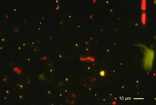 • Cyanobacteria belonging to the genus Prochlorococcus are particularly remarkable. With a typical size of 0.6 μm, Prochlorococcus was discovered only in 1988[7] by two American researchers, Sallie W. (Penny) Chisholm (Massachusetts Institute of Technology) and R.J. Olson (Woods Hole Oceanographic Institution). In spite of its small size, this photosynthetic organism is undoubtedly the most abundant of the planet: indeed its density can reach up to 100 million cells per liter and it can be found down to a depth of 150 m in all the intertropical belt.[17]