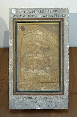 When the Bastille fell on 14 July 1789 there was some debate as to what should replace it, or indeed if it should remain as a monument to the past. However, Palloy knew exactly what he wanted to do and by that evening had begun the process of dismantling the structure; he secured the contract to demolish the building two days later.[2] Most of the building was removed over the subsequent months by approximately 1,000 workers.[3] The dimension stones were reused for the construction of the Pont de la Concorde.[4]