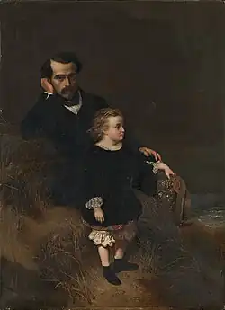 In 1847 he married the widow Zoé van Male de Brachene (1807-1848), whose husband, Captain Prosper Renoz, had died in Algeria. His son Oscar was born in 1848 but his wife died shortly after the birth, plunging the artist in a deep depression. Although his work, Attila's Last Charge in the Plains of Châlons-sur-Marne had garnered a vermeil medal in Brussels that year he did not paint for two years but traveled to Italy and Palestine. Then in 1854 and 1855, he joined his military friends from Algeria and served General Aimable Pélissier in the Crimean War as a military painter.[1] During this period he painted historical medieval subjects and portraits.[2] He worked with models both in studios and in exterior settings and his portraits, featuring exotic costumes, jewelry, and dusky sensual looks yet produced with a subtlety of tone and color were greatly prized by European collectors.[3] He also painted children at play, a popular theme in late nineteenth-century European and American Art as childhood was studied in terms of its significance to personal development and education.[4]
