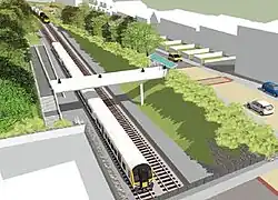 Initial plans for the station were for access to be from Monmouth Road, which runs parallel to the railway, north of the line. There was to be a fully accessible footbridge across the line, with both ramp and stairs, as well as a pedestrian crossing across Monmouth Road and a lit 50-space car park on the old goods yard at the eastern end of Monmouth Road. The very end of the goods yard would be maintained for Network Rail access.[14][19] These plans were changed following an agreement to acquire a property on Station Road. The new plans have the entrance to be on Station Road, at the east end of the site, meaning there would be no need for a footbridge. There would be disabled parking and a pick up/drop off point adjacent to the entrance, although the exact design of this area is still under consideration.[20] Noise mitigation options are to be investigated and there will be improvements to local footpaths.[14]