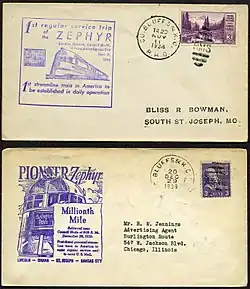 - ^ "Burlington "Zephyr" Here for Exhibition". The Hastings Democrat. Hastings, Nebraska. May 24, 1934. p. 1 – via Newspapers.com.