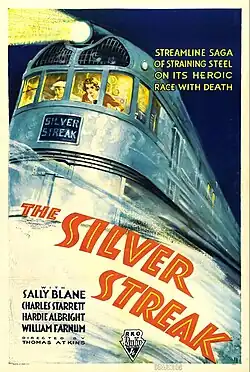 Press publicity had apparently first coined the term "Silver Streak". The Pioneer Zephyr's famous Denver-Chicago dash served as the inspiration for the 1934 film The Silver Streak starring Charles Starrett.[23][45] In that story, the crew was racing to the Boulder Dam construction site with an iron lung, with only moments to spare. The original Zephyr trainset was used for the exterior shots in the film, while interior scenes were filmed on a soundstage in Hollywood. For the film, the "Burlington Route" nameplate on the train's nose was replaced with one that read "Silver Streak".