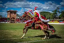Today Pirenópolis is known all over Brazil for its popular festivals, especially the "Cavalhadas", introduced in 1826, in which horsemen representing Moors and Christians recreate a battle fought by Charlemagne.[5] This tradition, part of the Festival for the Holy Spirit (Festa do Espírito Santo), was brought to the town by Portuguese settlers. The Festas de Cavalhadas feature a parade beginning with a bugle fanfare announcing the knight's pages, then the mounted knights displaying their colors. Wearing papier-maché helmets, the Christian knights wear blue, the Moors wear red. The battle lasts three days and attracts thousands of visitors to the town. The Cavalhadas take place in medieval costume, with the highlight being the mock battle, performed in the city's bullring. The Moors invariably are defeated and convert to Christianity. Cavalhadas