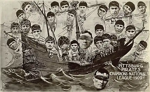 During the winter prior to the 1890 season, almost all of the Alleghenys' best players bolted to the Players' League's Pittsburgh Burghers. The Players' League collapsed after the season, and the players were allowed to go back to their old clubs. However, the Alleghenys also signed highly regarded second baseman Lou Bierbauer, who had previously played with the A.A.'s Philadelphia Athletics. Although the Athletics failed to include Bierbauer on their reserve list, they loudly protested the Alleghenys' move. In an official complaint, an AA official claimed the Alleghenys' signing of Bierbauer was "piratical".[12] This incident quickly accelerated into a schism between the leagues that contributed to the demise of the A.A. Although the Alleghenys were never found guilty of wrongdoing, their allegedly "piratical" act gained them the occasional nickname "Pirates" from newspapers around the country, starting in 1891. Within a few years, the nickname caught on with even Pittsburgh newspapers.[13] The nickname was first acknowledged on the team's uniforms in 1912.