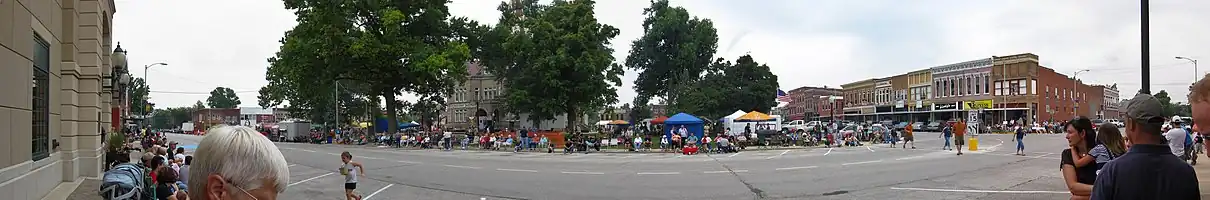 Panorama of the courthouse square; the courthouse is obscured by trees