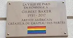 The official plaque in memory of Gilbert Baker, voted unanimously by the Council of Paris,[3] is situated on a wall of the square.[4]