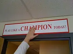 The term has been used by Notre Dame Fighting Irish football since at least 1986 when Lou Holtz came across a photo in a Notre Dame book with the sign “Play Like A Champion Today.” After asking around and coming up with no one remembering the sign and what had happened to it, he had a new sign painted and placed in a stairwell between the home team locker room and the tunnel to the field of Notre Dame Stadium.[1] This original sign was painted by Laurie Wenger in the fall of 1986.[2]